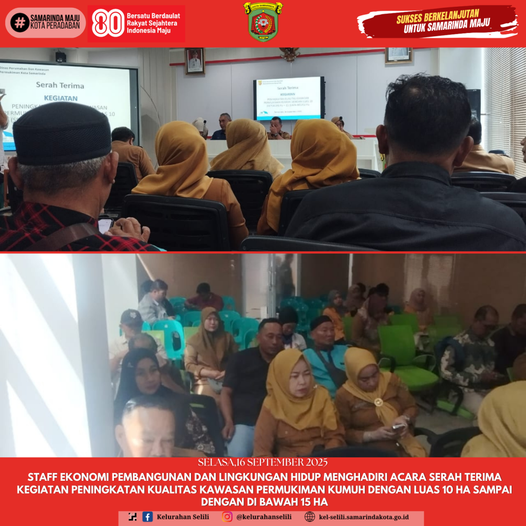 STAFF EKONOMI PEMBANGUNAN DAN LINGKUNGAN HIDUP MENGHADIRI ACARA SERAH TERIMA KEGIATAN PENINGKATAN KUALITAS KAWASAN PERMUKIMAN KUMUH DENGAN LUAS 10 ha sampai dengan di bawah 15 ha (16/09/2025)