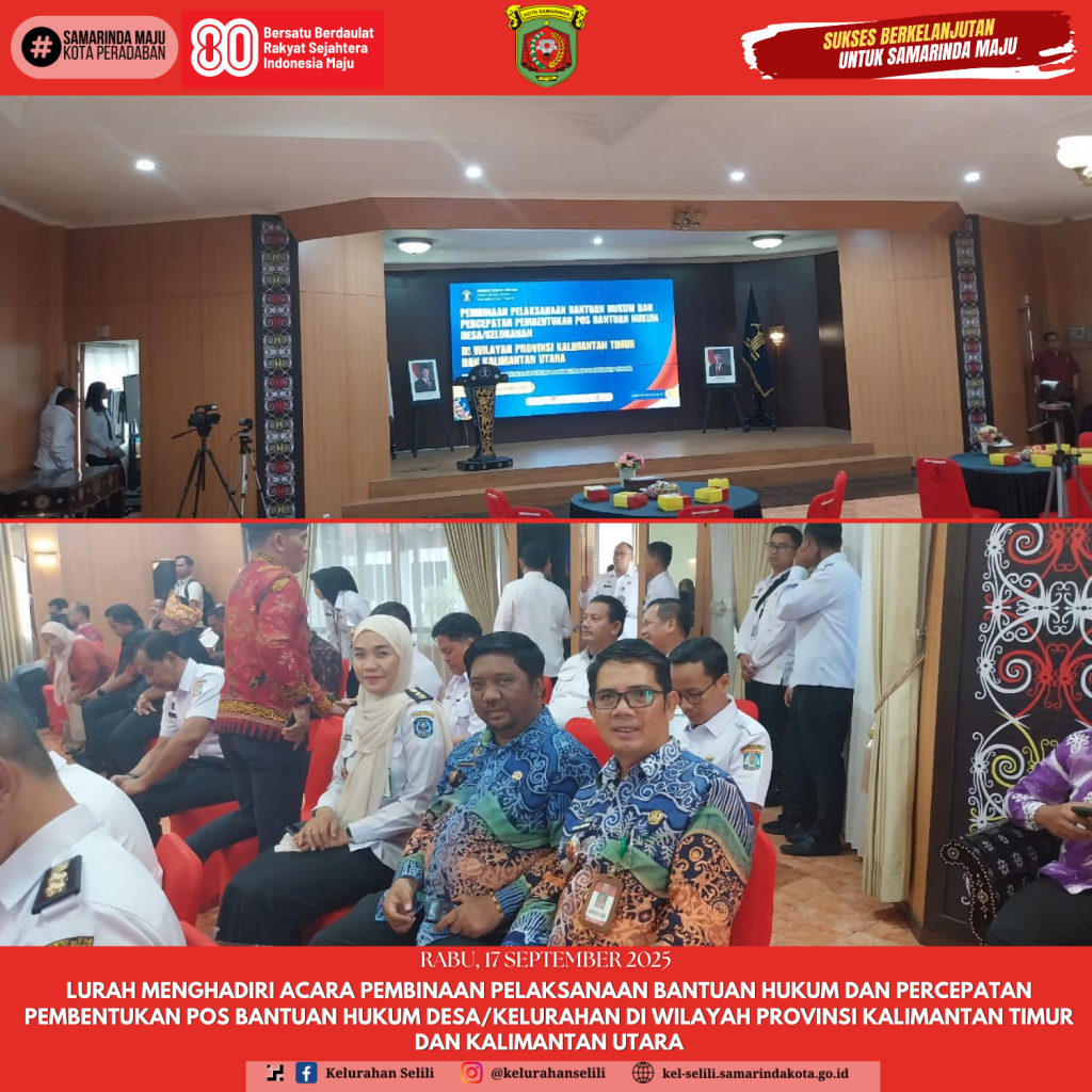 Lurah Selilli menghadiri Acara PEMBINAAN PELAKSANAAN BANTUAN HUKUM DAN PERCEPATAN PEMBENTUKAN POS BANTUAN HUKUM DESA/KELURAHAN DI WILAYAH PROVINSI KALIMANTAN TIMUR DAN KALIMANTAN UTARA (17/09/2025)
