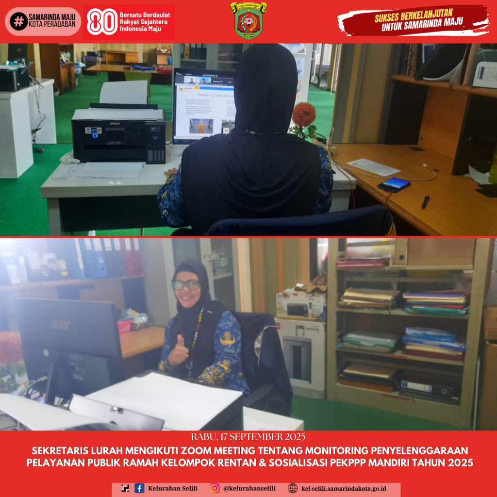 sekretaris lurah mengikuti zoom meeting tentang monitoring penyelenggaraan pelayanan publik ramah kelompok rentan & sosialisasi PEKPPP Mandiri tahun 2025 (17/09/2025)