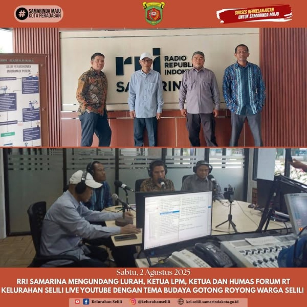 RRI Samarinda mengundang Lurah Selili, Ketua LPM, serta Ketua dan Humas Forum RT Kelurahan Selili dalam program siaran langsung melalui kanal YouTube dengan mengangkat tema “Budaya Gotong Royong Warga Selili”.