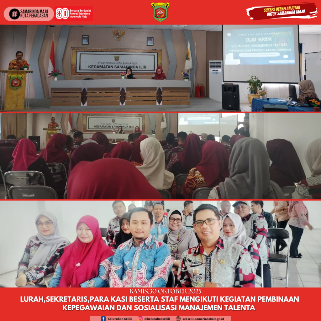 LURAH,SEKRETARIS,PARA KASI BESERTA STAF MENGIKUTI KEGIATAN PEMBINAAN KEPEGAWAIAN DAN SOSIALISASI MANAJEMEN TALENTA DI AULA KECAMATAN SAMARINDA ILIR (30/10/2025)