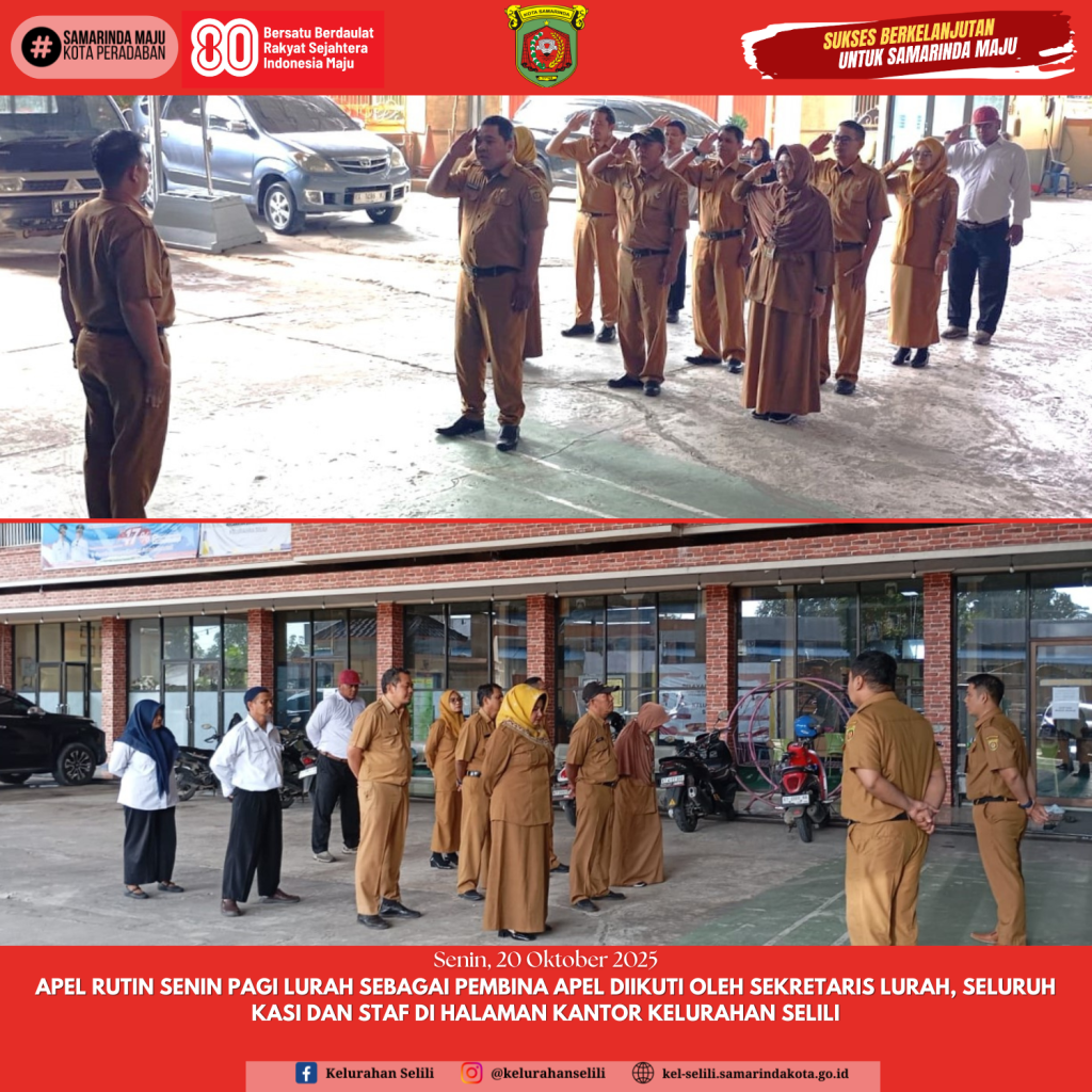 Apel Rutin Senin Pagi Lurah Sebagai Pembina Apel diikuti oleh Sekretaris Lurah,Seluruh Kasi Beserta Staf Kelurahan Selili di Halaman Kantor Kelurahan Selili (20/10/2025) October 20, 2025 Apel Rutin Senin Pagi, Wujud Disiplin dan Kekompakan Aparatur Kelurahan Selili Samarinda – Senin (20/10/2025), Kelurahan Selili melaksanakan